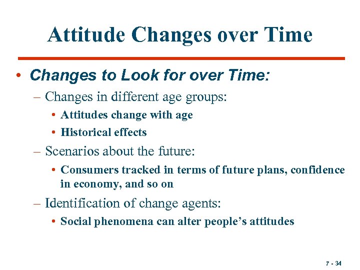 Tracking Attitudes over Time • Attitude-tracking program: – An single-attitude survey is a snapshot in time – A program allows researchers to analyze attitude trends during an extended period of time • Ongoing Tracking Studies – Attitude tracking involves administration of a survey at regular intervals (e. g. Gallup Poll, Yankelovich Monitor) – This activity is valuable for making strategic decisions 7 - 33