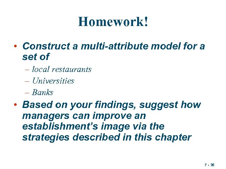 Homework! • Construct a multi-attribute model for a set of – local restaurants – Universities – Banks • Based on your findings, suggest how managers can improve an establishment’s image via the strategies described in this chapter 7 - 36