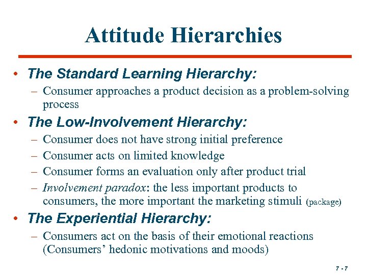 Attitude Hierarchies • The Standard Learning Hierarchy: – Consumer approaches a product decision as a problem-solving process • The Low-Involvement Hierarchy: – – Consumer does not have strong initial preference Consumer acts on limited knowledge Consumer forms an evaluation only after product trial Involvement paradox: the less important products to consumers, the more important the marketing stimuli (package) • The Experiential Hierarchy: – Consumers act on the basis of their emotional reactions (Consumers’ hedonic motivations and moods) 7 -7