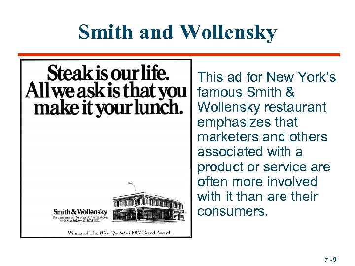 Smith and Wollensky • This ad for New York’s famous Smith & Wollensky restaurant emphasizes that marketers and others associated with a product or service are often more involved with it than are their consumers. 7 -9
