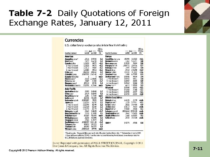 Table 7 -2 Daily Quotations of Foreign Exchange Rates, January 12, 2011 Copyright © 2012 Pearson Addison-Wesley. All rights reserved. 7 -11