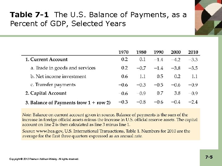 Table 7 -1 The U. S. Balance of Payments, as a Percent of GDP, Selected Years Copyright © 2012 Pearson Addison-Wesley. All rights reserved. 7 -5