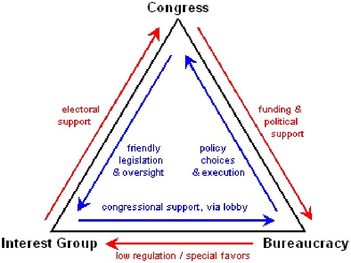 C. Lobbying the bureaucracy 1. Iron-triangles (next slide) 2. Policy Networks (groups, policymakers, businesses, agency officials, all develop working relationships that often make policydecisions on their own. 3. Revolving Doors – from regulated to regulating to regulated again