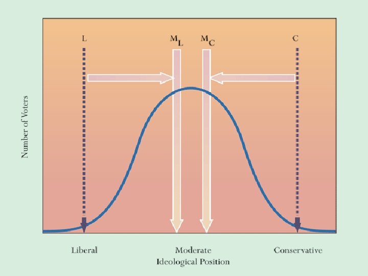 Chapter 7 (parties and interest groups) I. Political organization – parties and groups that function as intermediaries between individuals and government. • Political Parties – organizations that seek to achieve power by winning public office. • Interest Groups – organizations seeking to ______ government policy. II. Political Parties and Democratic Government A. “Responsible” Party system – System in which competitive parties adopt principles, recruit candidates and direct campaigns based upon the ______, and hold their elected officials responsible for enacting it. (parties are powerful and essential). B. Winning trumps _______ system – “Winning has generally been more important than any principles or policies” in the U. S. Parties in the U. S. are more concerned with vote-maximizing that platforms. Since more votes are at the _____ of the distribution, a middle-of-the-road approach is attractive in our system (Fig. 7. 3). C. However, since the 1970 s, we have seen steady party polarization. See Table 7. 1/Fig. 7. 4