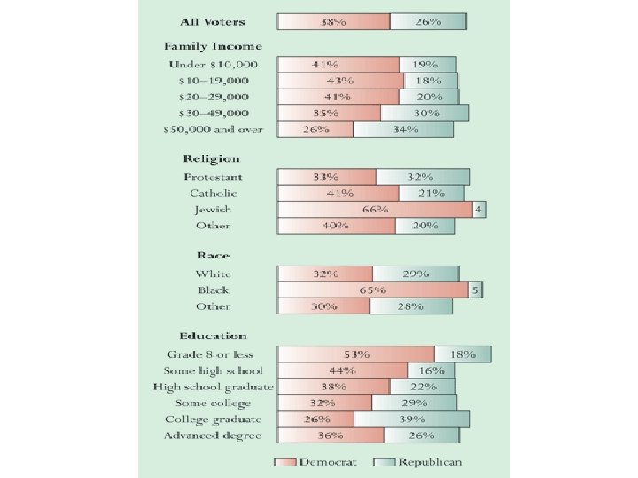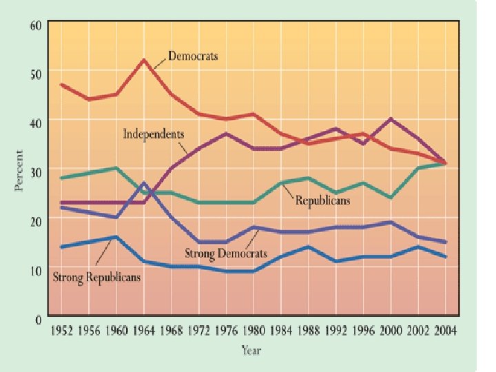 IV. Where is the Party? • • • Party in the Electorate – voters who identify with party Party in the Government – Party members holding office Party in the Organization – actual organization A. Party Voters • Party Identification (Fig. 7. 5): Dems win over Reps narrowly) – “Generally Speaking, how would you identify yourself: as a Rep. , Dem. , independent, or something else? ” • Independents – both parties have _______ identifiers and independent identifiers have increased. • Dealignment – the decline in attractiveness of political parties to voters, or some group of voters. • Party Loyalty in Voting – party identifiers are highly likely to vote for their party’s nominee (less true for ____ with respect to Republican presidential candidates). • Realignment – Long-term shift in social-group support for various political parties that creates new coalitions in each party. (e. g. , Jackson, Dems 1824, Lincoln, Republicans 1860, Bryan Democrats 1896, 1932 FDR Dems). • Are we experiencing realignment?