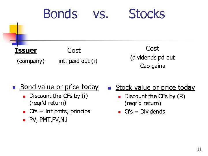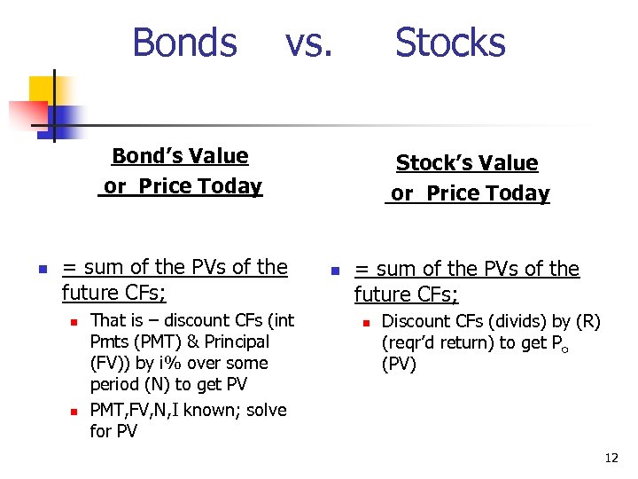 Bonds Issuer (company) n vs. n n Cost (dividends pd out Cap gains int. paid out (i) Bond value or price today n Stocks Discount the CFs by (i) (reqr’d return) Cfs = Int pmts; principal PV, PMT, FV, N, i n Stock value or price today n n Discount the CFs by (R) (reqr’d return) Cfs = Dividends 11