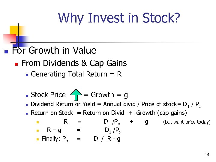 Why Invest in Stock? n For Growth in Value n From Dividends & Cap Gains n Generating Total Return = R n Stock Price n n Dividend Return on Stock n R–g n Finally: Po = Growth = g or Yield = Annual divid / Price of stock= D 1 / Po = Return on Divid + Growth (cap gains) = D 1 /Po + g (but want price today) = D 1 /Po = D 1 / R - g 14