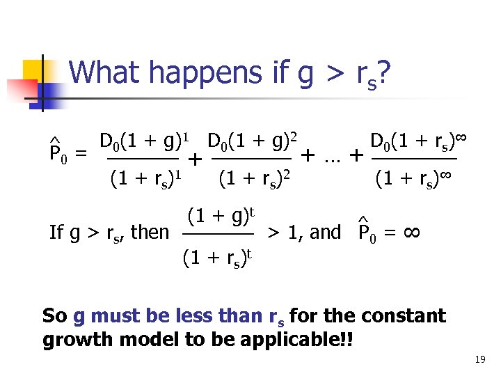 Dividend Growth and PV of Dividends: P 0 = ∑(PV of Dt) $ 0. 25 Dt = D 0(1 + g)t Dt PV of Dt = (1 + r)t If g > r, P 0 = ∞ ! Years (t) 18