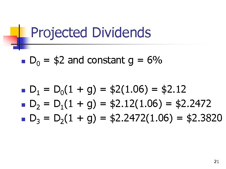 Projected Dividends n n D 0 = $2 and constant g = 6% D 1 = D 0(1 + g) = $2(1. 06) = $2. 12 D 2 = D 1(1 + g) = $2. 12(1. 06) = $2. 2472 D 3 = D 2(1 + g) = $2. 2472(1. 06) = $2. 3820 21