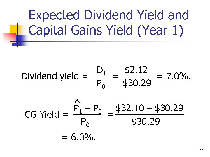 Return = Dividend Yield + Capital Gains Yield D 1 Dividend yield = P 0 ^ P 1 – P 0 CG Yield = = P 0 New - Old 25