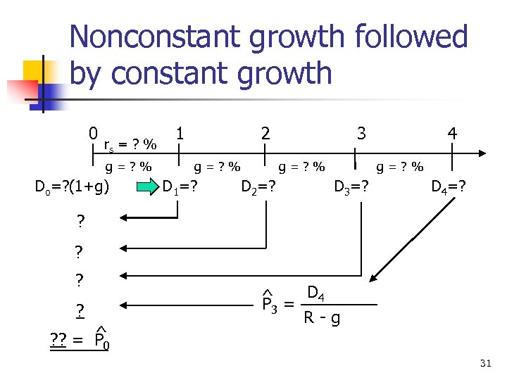Nonconstant growth followed by constant growth (D 0 = $2): 0 rs = 13% g = 30% Do=2. 00(1+g) 1 2 g = 30% D 1=2. 60 3 g = 30% D 2=3. 38 4 g = 6% D 3=4. 39 D 4=4. 66 2. 30 2. 65 3. 05 46. 11 54. 11 = P 0 ^ $4. 66 ^ = $66. 54 P 3 = 0. 13 – 0. 06 32
