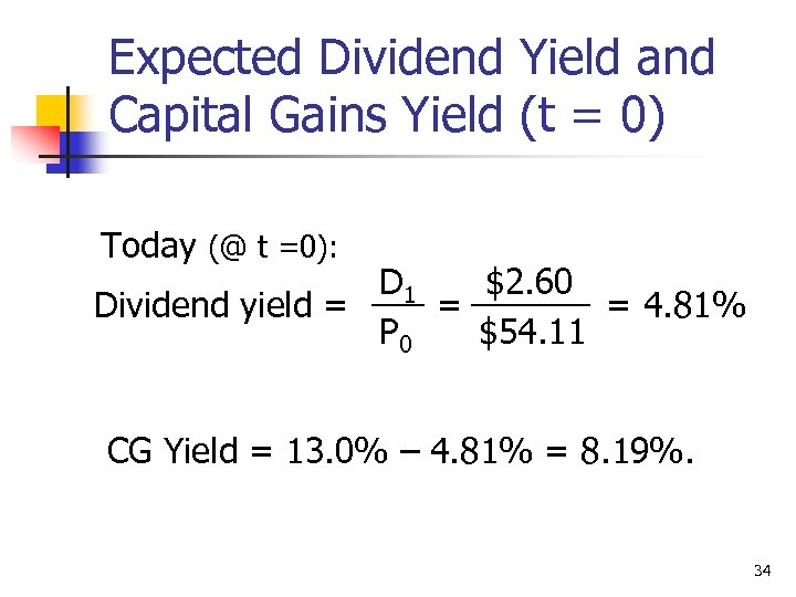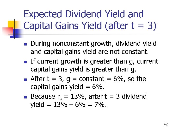 Expected Dividend Yield and Capital Gains Yield (t = 0) At t = 0: D 1 $2. 60 Dividend yield = = = 5. 6% P 0 $46. 66 CG Yield = 13. 0% – 5. 6% = 7. 4%. (More…) 41