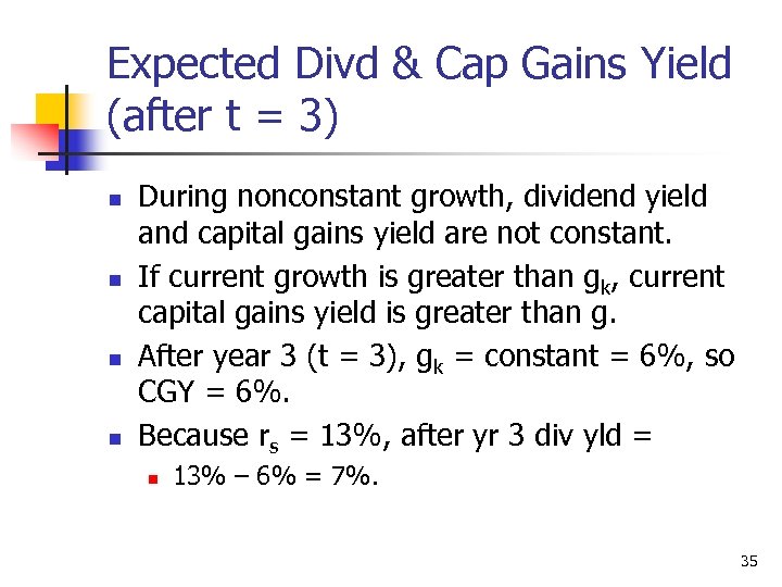 Expected Dividend Yield and Capital Gains Yield (t = 0) Today (@ t =0): D 1 $2. 60 Dividend yield = = = 4. 81% P 0 $54. 11 CG Yield = 13. 0% – 4. 81% = 8. 19%. 34
