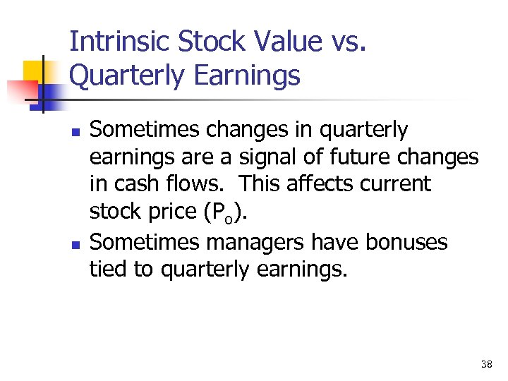 Intrinsic Stock Value vs. Quarterly Earnings n n Sometimes changes in quarterly earnings are a signal of future changes in cash flows. This affects current stock price (Po). Sometimes managers have bonuses tied to quarterly earnings. 38