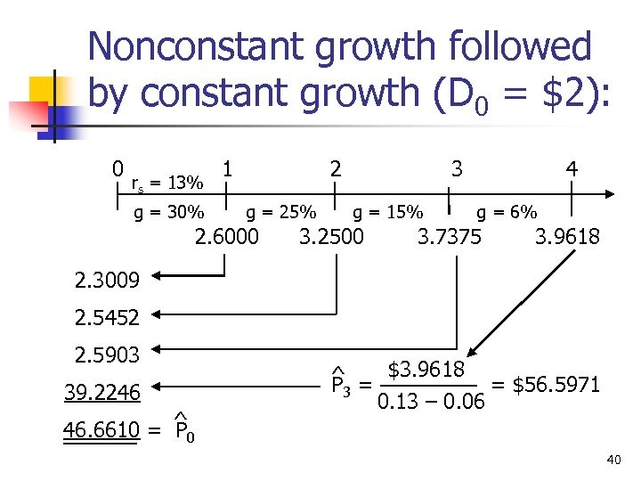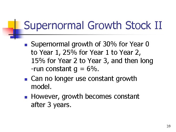 Supernormal Growth Stock II n n n Supernormal growth of 30% for Year 0 to Year 1, 25% for Year 1 to Year 2, 15% for Year 2 to Year 3, and then long -run constant g = 6%. Can no longer use constant growth model. However, growth becomes constant after 3 years. 39