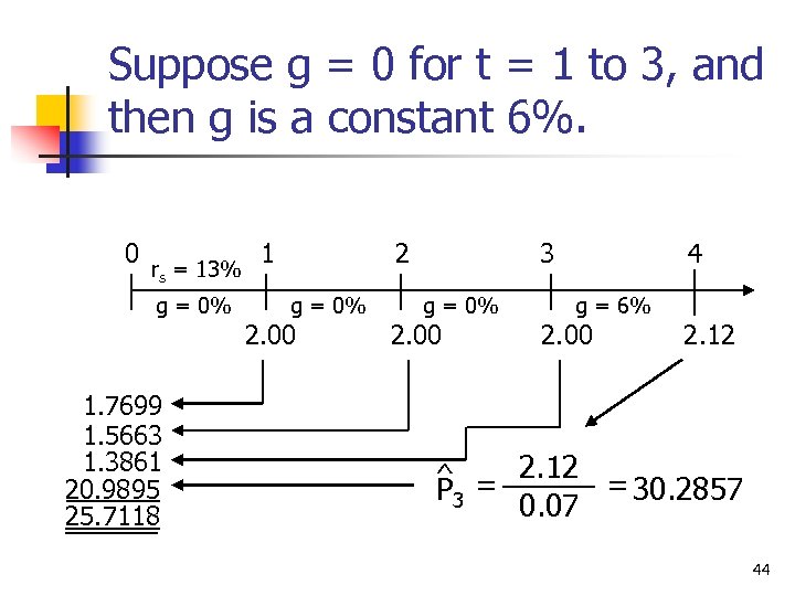 Suppose g = 0 for t = 1 to 3, and then g is a constant 6%. 0 rs = 13% g = 0% 1. 7699 1. 5663 1. 3861 20. 9895 25. 7118 1 2 g = 0% 2. 00 3 g = 0% 2. 00 4 g = 6% 2. 00 ^ = 2. 12 P 3 0. 07 2. 12 = 30. 2857 44