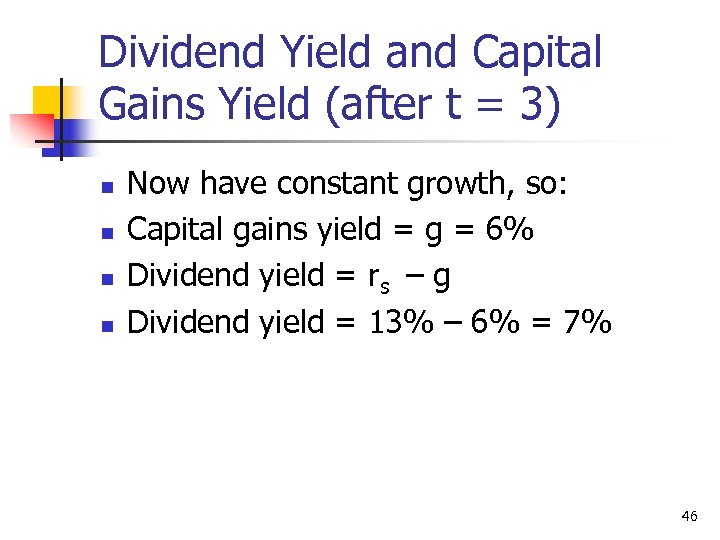 Dividend Yield and Capital Gains Yield (t = 0) n Dividend Yield = D 1/P 0 Dividend Yield = $2. 00/$25. 72 Dividend Yield = 7. 8% n CGY = 13. 0% – 7. 8% = 5. 2%. n n 45
