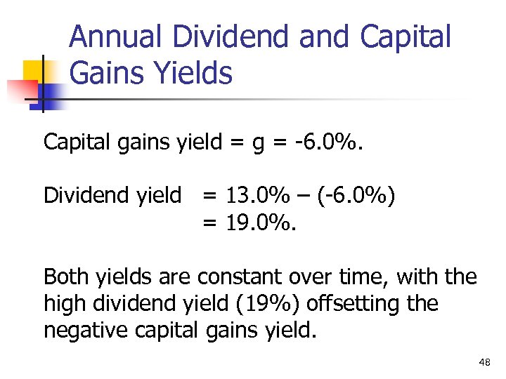 Annual Dividend and Capital Gains Yields Capital gains yield = g = -6. 0%. Dividend yield = 13. 0% – (-6. 0%) = 19. 0%. Both yields are constant over time, with the high dividend yield (19%) offsetting the negative capital gains yield. 48