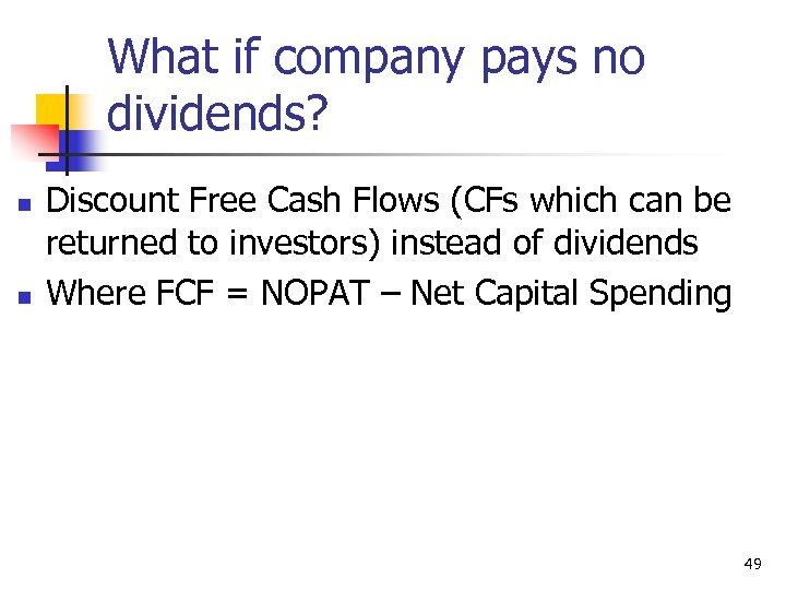 What if company pays no dividends? n n Discount Free Cash Flows (CFs which can be returned to investors) instead of dividends Where FCF = NOPAT – Net Capital Spending 49