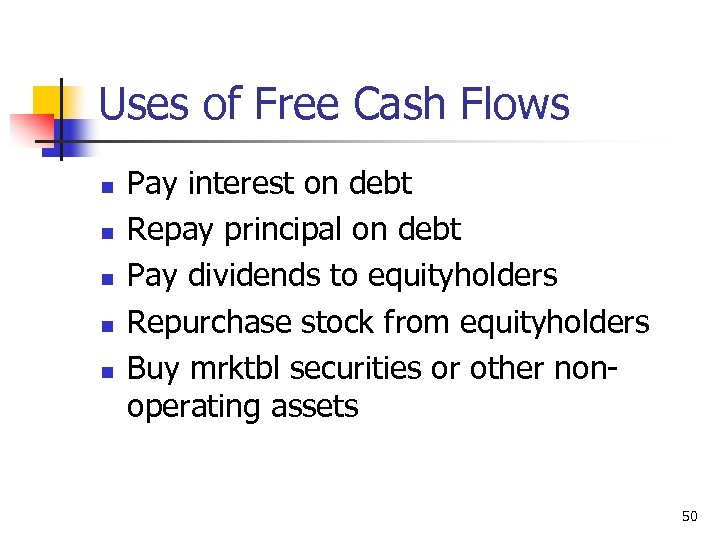Uses of Free Cash Flows n n n Pay interest on debt Repay principal on debt Pay dividends to equityholders Repurchase stock from equityholders Buy mrktbl securities or other nonoperating assets 50
