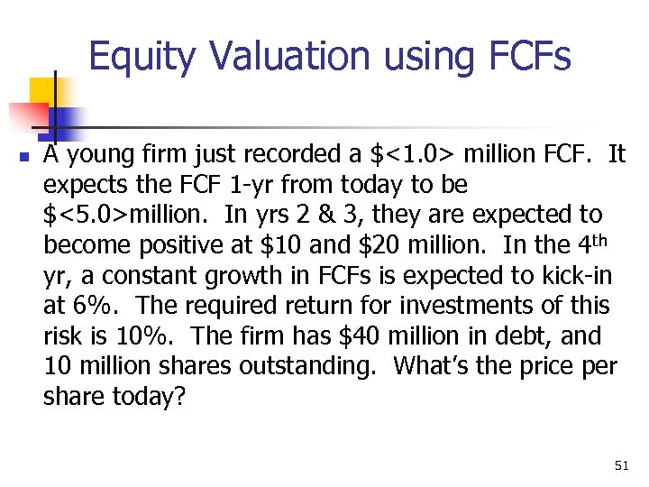 Equity Valuation using FCFs n A young firm just recorded a $<1. 0> million FCF. It expects the FCF 1 -yr from today to be $<5. 0>million. In yrs 2 & 3, they are expected to become positive at $10 and $20 million. In the 4 th yr, a constant growth in FCFs is expected to kick-in at 6%. The required return for investments of this risk is 10%. The firm has $40 million in debt, and 10 million shares outstanding. What’s the price per share today? 51
