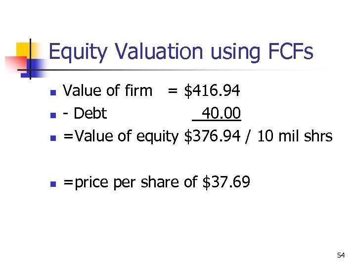 Equity Valuation using FCFs n Value of firm = $416. 94 - Debt 40. 00 =Value of equity $376. 94 / 10 mil shrs n =price per share of $37. 69 n n 54