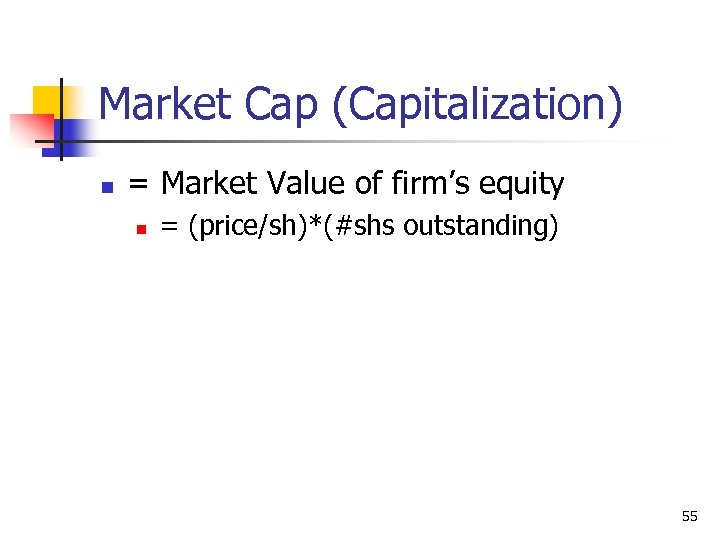 Market Cap (Capitalization) n = Market Value of firm’s equity n = (price/sh)*(#shs outstanding) 55