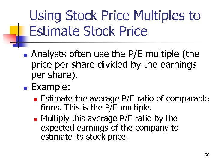 Using Stock Price Multiples to Estimate Stock Price n n Analysts often use the P/E multiple (the price per share divided by the earnings per share). Example: n n Estimate the average P/E ratio of comparable firms. This is the P/E multiple. Multiply this average P/E ratio by the expected earnings of the company to estimate its stock price. 58