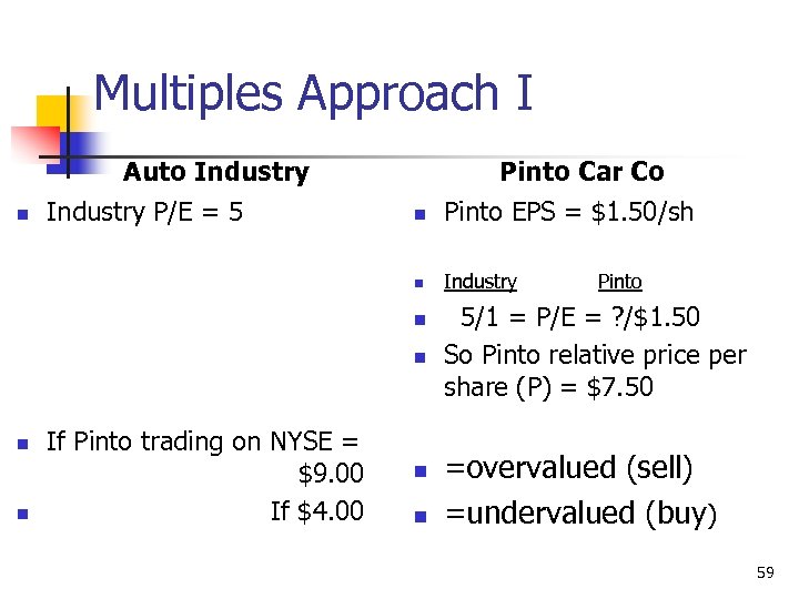 Multiples Approach I Auto Industry n Pinto EPS = $1. 50/sh n n Industry P/E = 5 Pinto Car Co Industry n n If Pinto trading on NYSE = $9. 00 If $4. 00 n n Pinto 5/1 = P/E = ? /$1. 50 So Pinto relative price per share (P) = $7. 50 =overvalued (sell) =undervalued (buy) 59