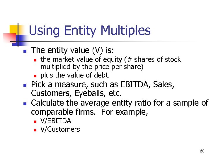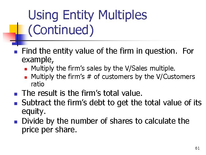 Using Entity Multiples n The entity value (V) is: n n the market value of equity (# shares of stock multiplied by the price per share) plus the value of debt. Pick a measure, such as EBITDA, Sales, Customers, Eyeballs, etc. Calculate the average entity ratio for a sample of comparable firms. For example, n n V/EBITDA V/Customers 60