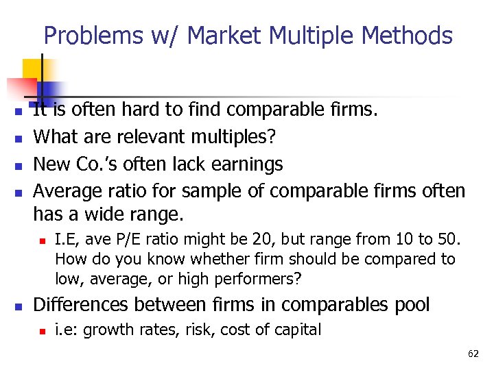 Problems w/ Market Multiple Methods n n It is often hard to find comparable firms. What are relevant multiples? New Co. ’s often lack earnings Average ratio for sample of comparable firms often has a wide range. n n I. E, ave P/E ratio might be 20, but range from 10 to 50. How do you know whether firm should be compared to low, average, or high performers? Differences between firms in comparables pool n i. e: growth rates, risk, cost of capital 62