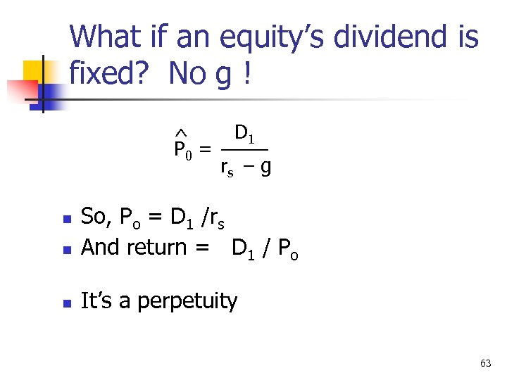 What if an equity’s dividend is fixed? No g ! ^ P 0 = D 1 rs – g n So, Po = D 1 /rs And return = D 1 / Po n It’s a perpetuity n 63