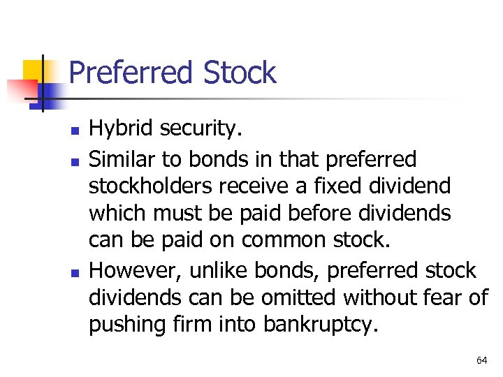 Preferred Stock n n n Hybrid security. Similar to bonds in that preferred stockholders receive a fixed dividend which must be paid before dividends can be paid on common stock. However, unlike bonds, preferred stock dividends can be omitted without fear of pushing firm into bankruptcy. 64