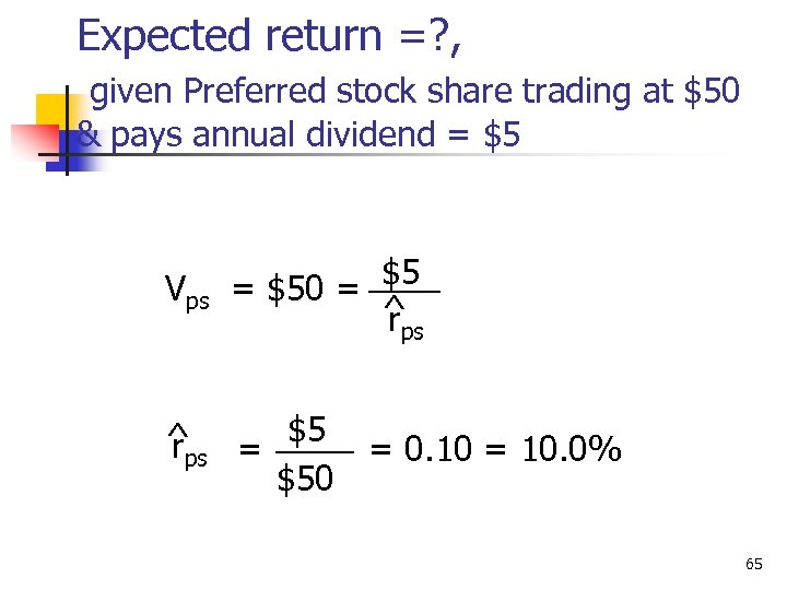 Expected return =? , given Preferred stock share trading at $50 & pays annual dividend = $5 Vps $5 = $50 = ^ rps ^ = $5 = 0. 10 = 10. 0% rps $50 65