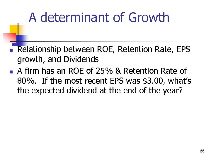 A determinant of Growth n n Relationship between ROE, Retention Rate, EPS growth, and Dividends A firm has an ROE of 25% & Retention Rate of 80%. If the most recent EPS was $3. 00, what’s the expected dividend at the end of the year? 66