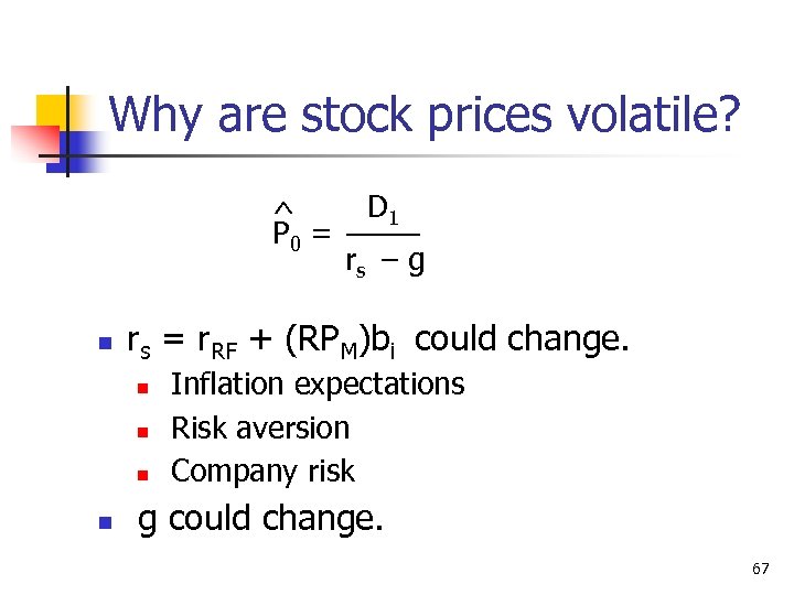 Why are stock prices volatile? ^ P 0 = n rs – g rs = r. RF + (RPM)bi could change. n n D 1 Inflation expectations Risk aversion Company risk g could change. 67
