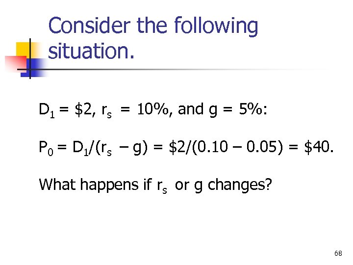 Consider the following situation. D 1 = $2, rs = 10%, and g = 5%: P 0 = D 1/(rs – g) = $2/(0. 10 – 0. 05) = $40. What happens if rs or g changes? 68