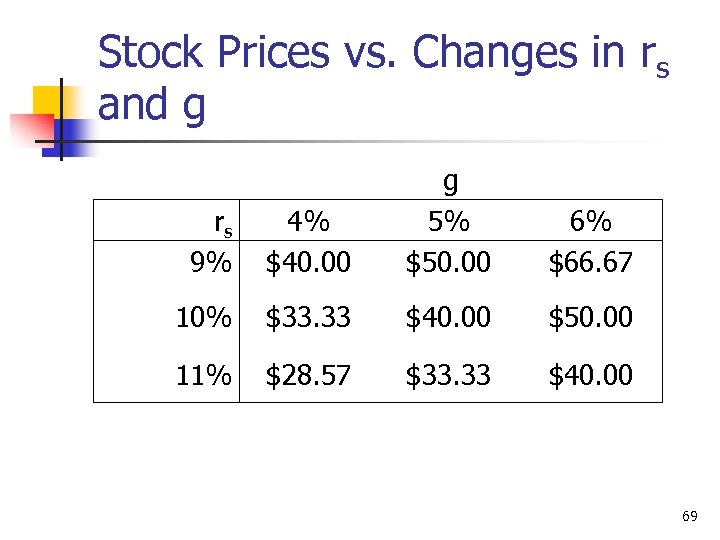 Stock Prices vs. Changes in rs and g rs 9% 4% $40. 00 g 5% $50. 00 10% $33. 33 $40. 00 $50. 00 11% $28. 57 $33. 33 $40. 00 6% $66. 67 69