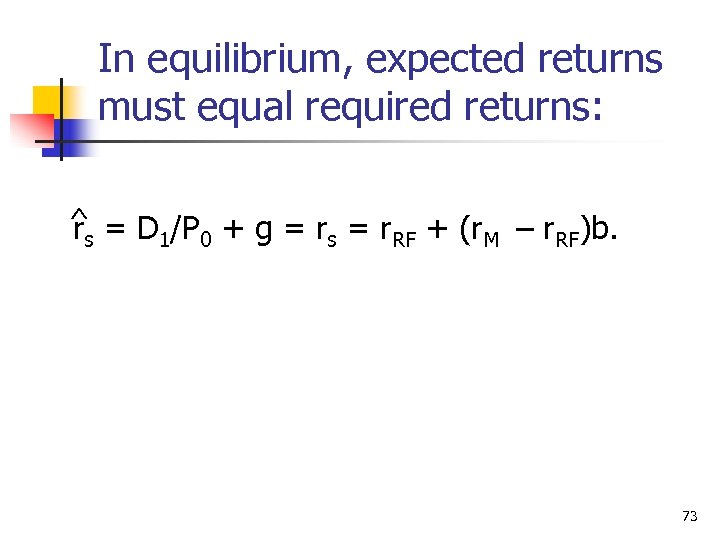 In equilibrium, expected returns must equal required returns: ^ = D /P + g = r + (r – r )b. rs 1 0 s RF M RF 73
