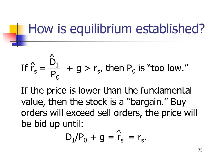 How is equilibrium established? ^ ^ = D 1 + g > r , then P is “too low. ” If rs s 0 P 0 If the price is lower than the fundamental value, then the stock is a “bargain. ” Buy orders will exceed sell orders, the price will be bid up until: ^ D 1/P 0 + g = rs. 75