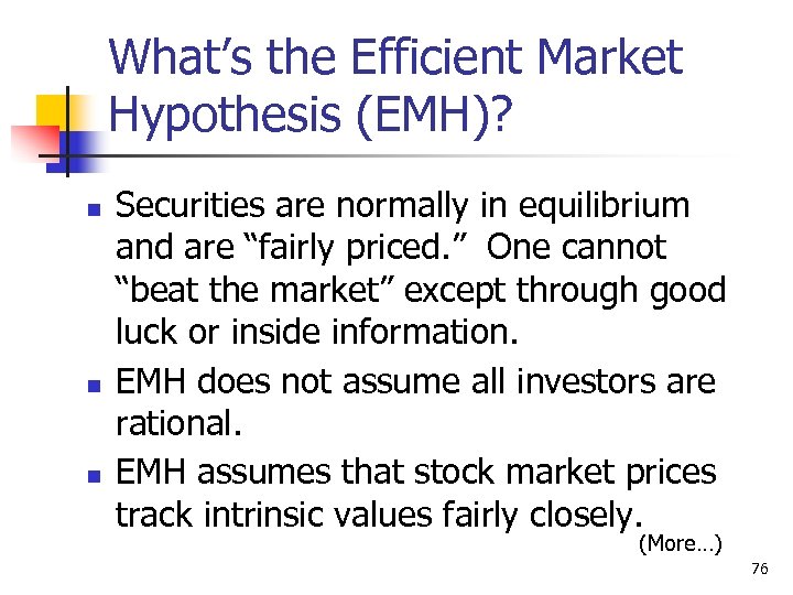 What’s the Efficient Market Hypothesis (EMH)? n n n Securities are normally in equilibrium and are “fairly priced. ” One cannot “beat the market” except through good luck or inside information. EMH does not assume all investors are rational. EMH assumes that stock market prices track intrinsic values fairly closely. (More…) 76
