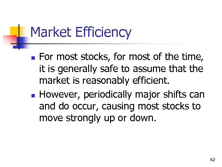 Market Efficiency n n For most stocks, for most of the time, it is generally safe to assume that the market is reasonably efficient. However, periodically major shifts can and do occur, causing most stocks to move strongly up or down. 82