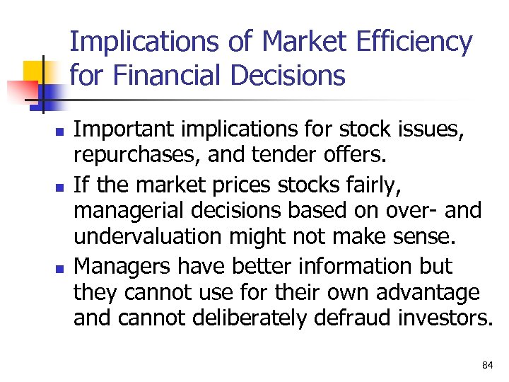 Implications of Market Efficiency for Financial Decisions n n n Important implications for stock issues, repurchases, and tender offers. If the market prices stocks fairly, managerial decisions based on over- and undervaluation might not make sense. Managers have better information but they cannot use for their own advantage and cannot deliberately defraud investors. 84
