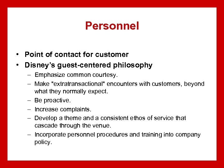 Personnel • Point of contact for customer • Disney’s guest-centered philosophy – Emphasize common courtesy. – Make "extratransactional" encounters with customers, beyond what they normally expect. – Be proactive. – Increase complaints. – Develop a theme and a consistent ethos of service that cascade through the venue. – Incorporate personnel procedures and training into company policy.