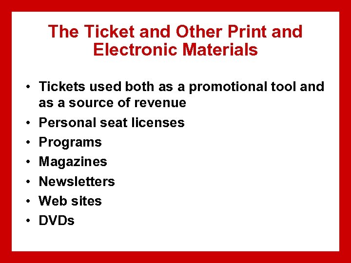 The Ticket and Other Print and Electronic Materials • Tickets used both as a promotional tool and as a source of revenue • Personal seat licenses • Programs • Magazines • Newsletters • Web sites • DVDs