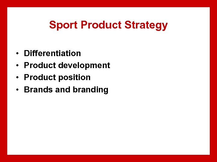 Sport Product Strategy • • Differentiation Product development Product position Brands and branding