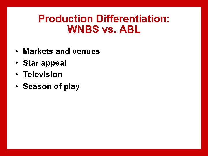 Production Differentiation: WNBS vs. ABL • • Markets and venues Star appeal Television Season of play