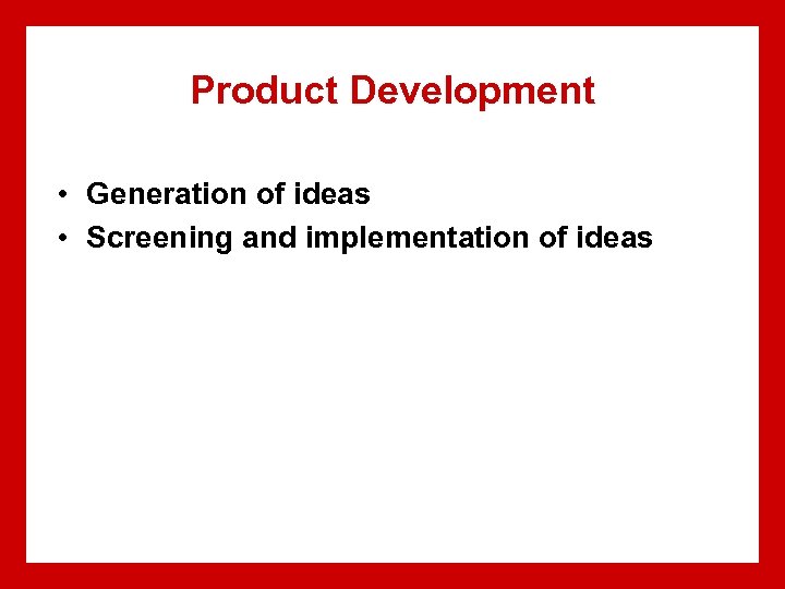 Product Development • Generation of ideas • Screening and implementation of ideas