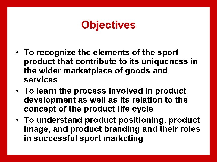 Objectives • To recognize the elements of the sport product that contribute to its uniqueness in the wider marketplace of goods and services • To learn the process involved in product development as well as its relation to the concept of the product life cycle • To understand product positioning, product image, and product branding and their roles in successful sport marketing