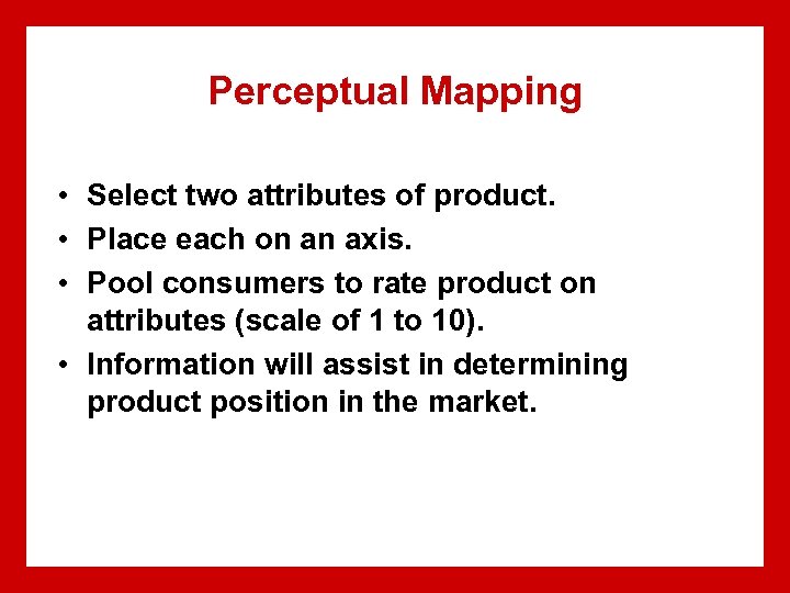 Perceptual Mapping • Select two attributes of product. • Place each on an axis. • Pool consumers to rate product on attributes (scale of 1 to 10). • Information will assist in determining product position in the market.